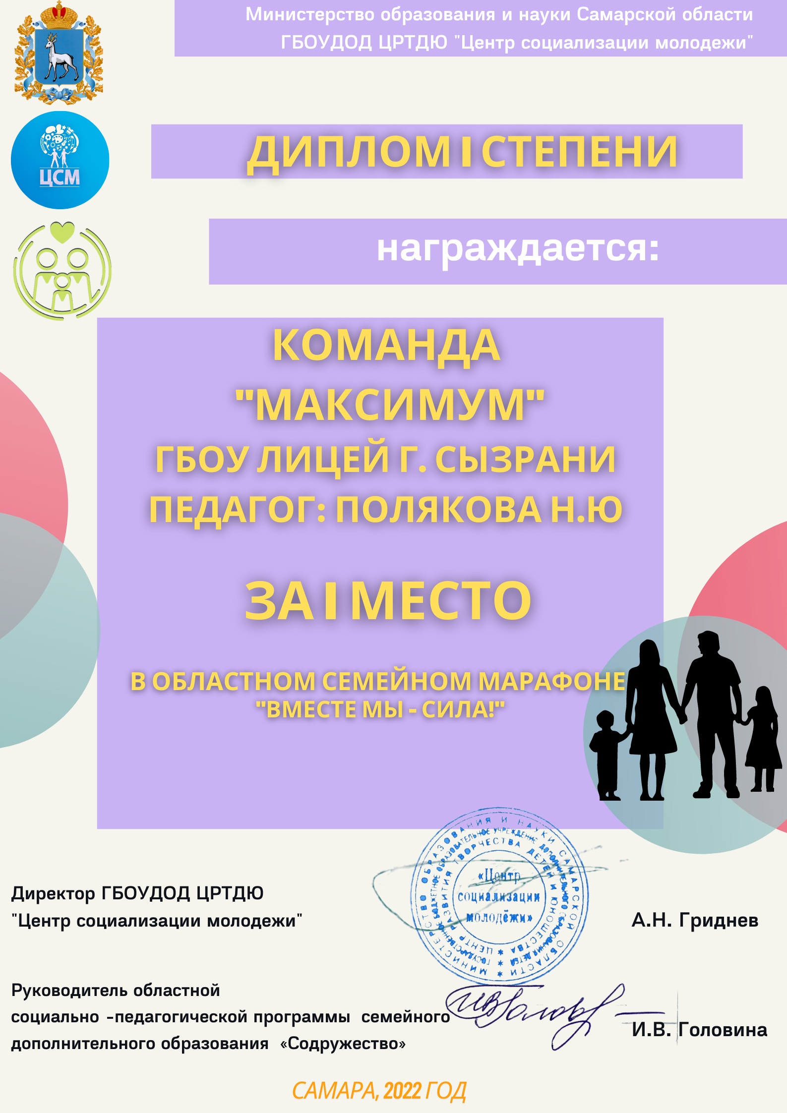 Семейная команда «Максимум» обучающихся ГБОУ лицей г. Сызрани 3А класса Гараниной Дарьи и Марии заняла 1 место .
