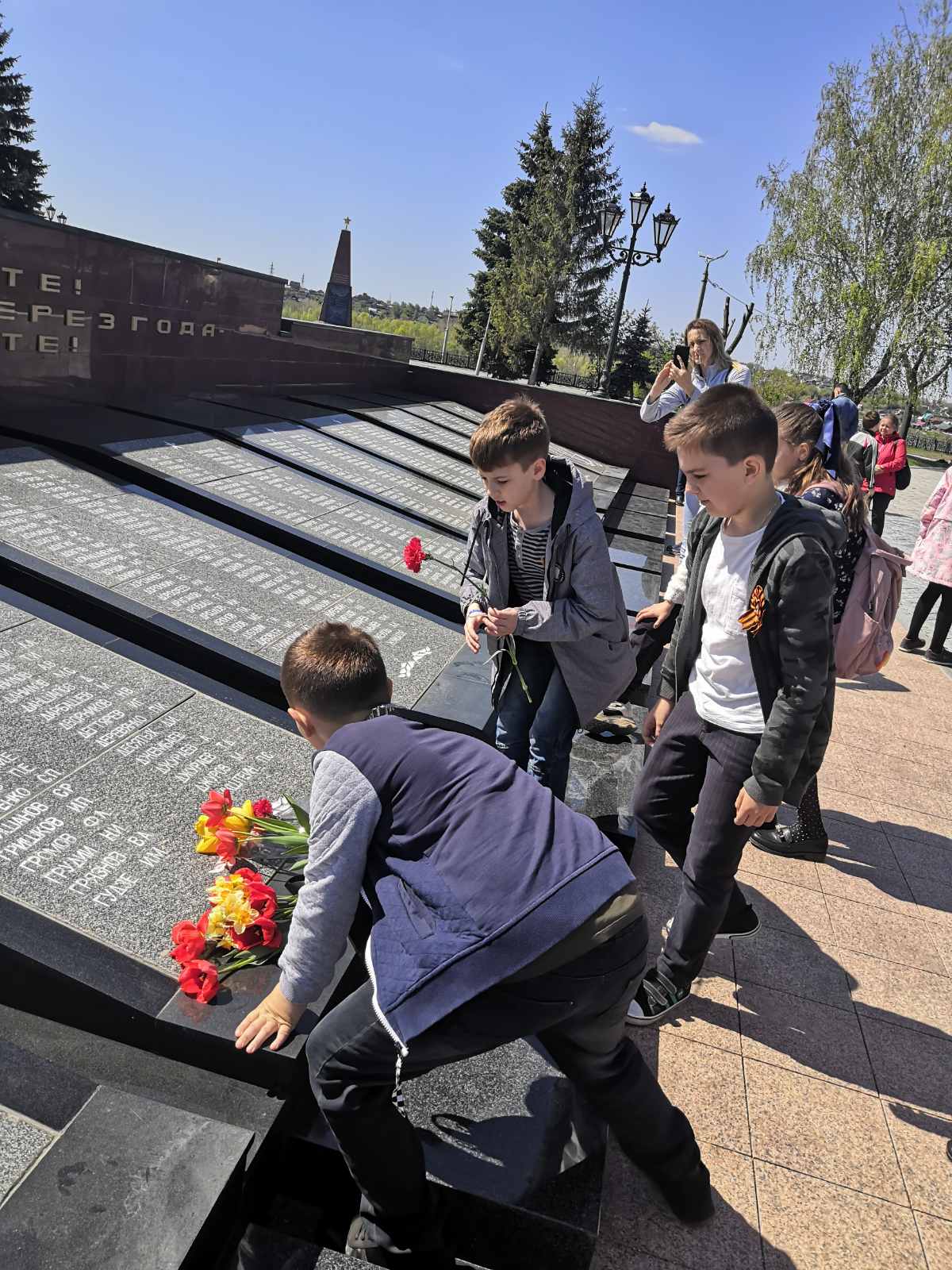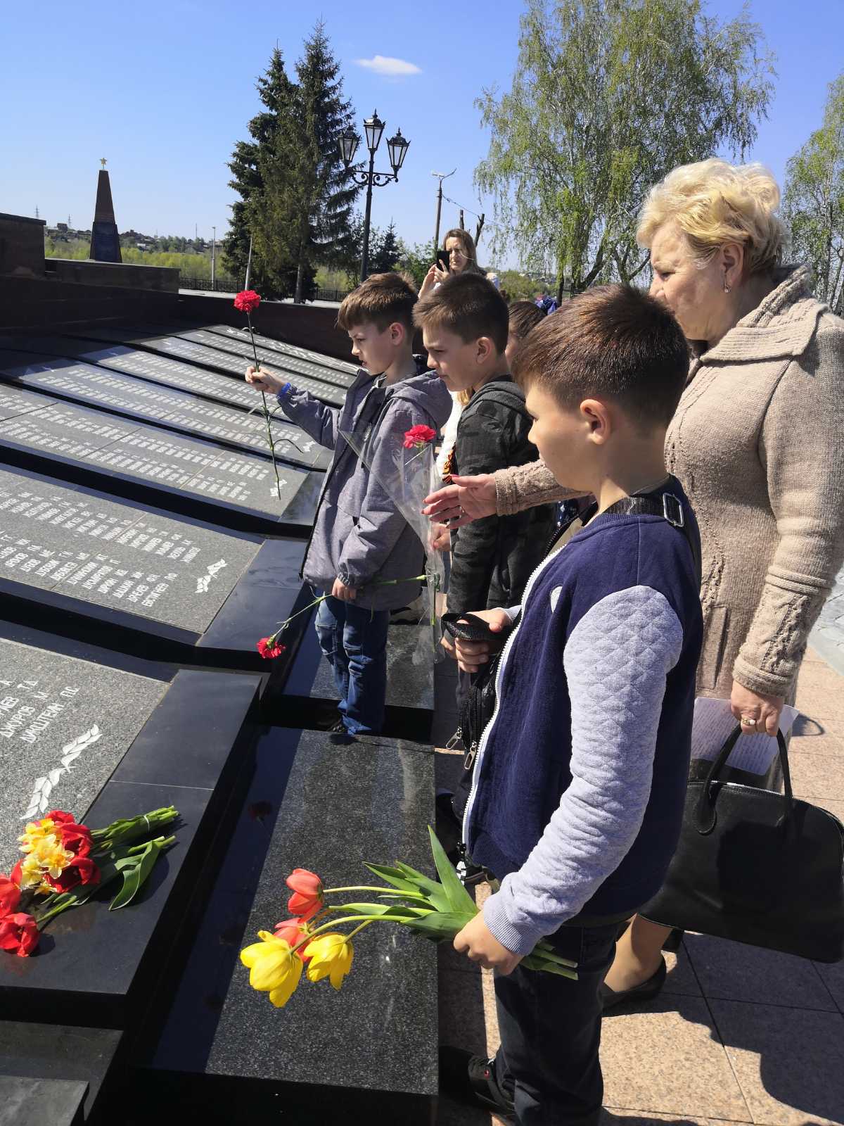 6 мая  ребята 3-а класса пришли в мемориальный комплекс «Вечный огонь», чтобы почтить память погибших на войне. Вспомнить работников госпиталей, тружеников тыла. Благодаря им всем над нами мирное небо. Ученик 3А класса показал фамилию своего прадеда, который захоронен у Кремля.