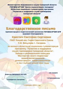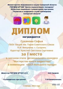 В мае 2024 года проходил заочный региональный этап Всероссийского конкурса участников школьных служб примирения «Мастерство юных медиаторов». Софья Суханова, обучающаяся 9 «А» класса ГБОУ лицей г. Сызрани заняла заслуженное первое место в номинации «ШСП большого города».