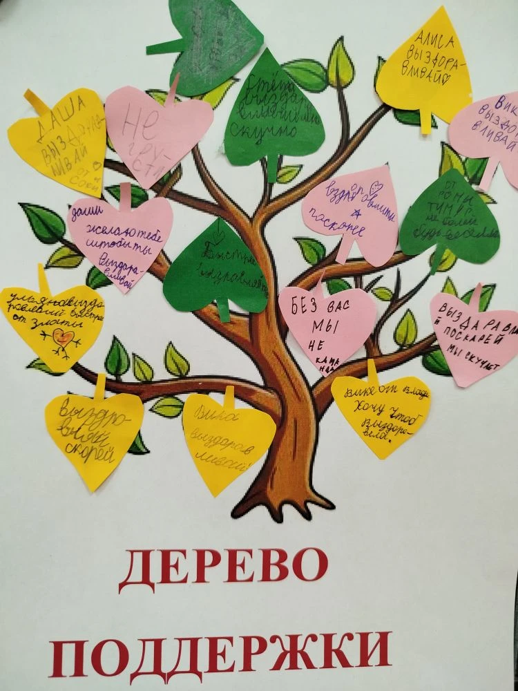 Учащиеся анонимно или открыто писали на специально оформленном «Дереве поддержки» слова ободрения для своих одноклассников, которые, по их мнению, сейчас нуждаются в поддержке (пропускают уроки по болезни).